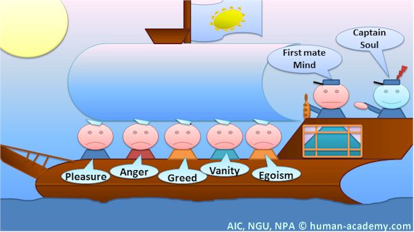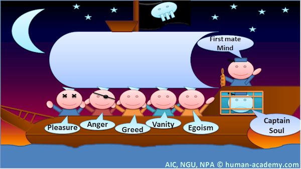 This has made man a slave instead of a free being here on Earth. Below you can see which mind-based characteristics are governing in the majority, with the help of the first mate (Mind), while the Captain (Soul consciousness) is imprisoned and locked in its narrow space (isolation cell).